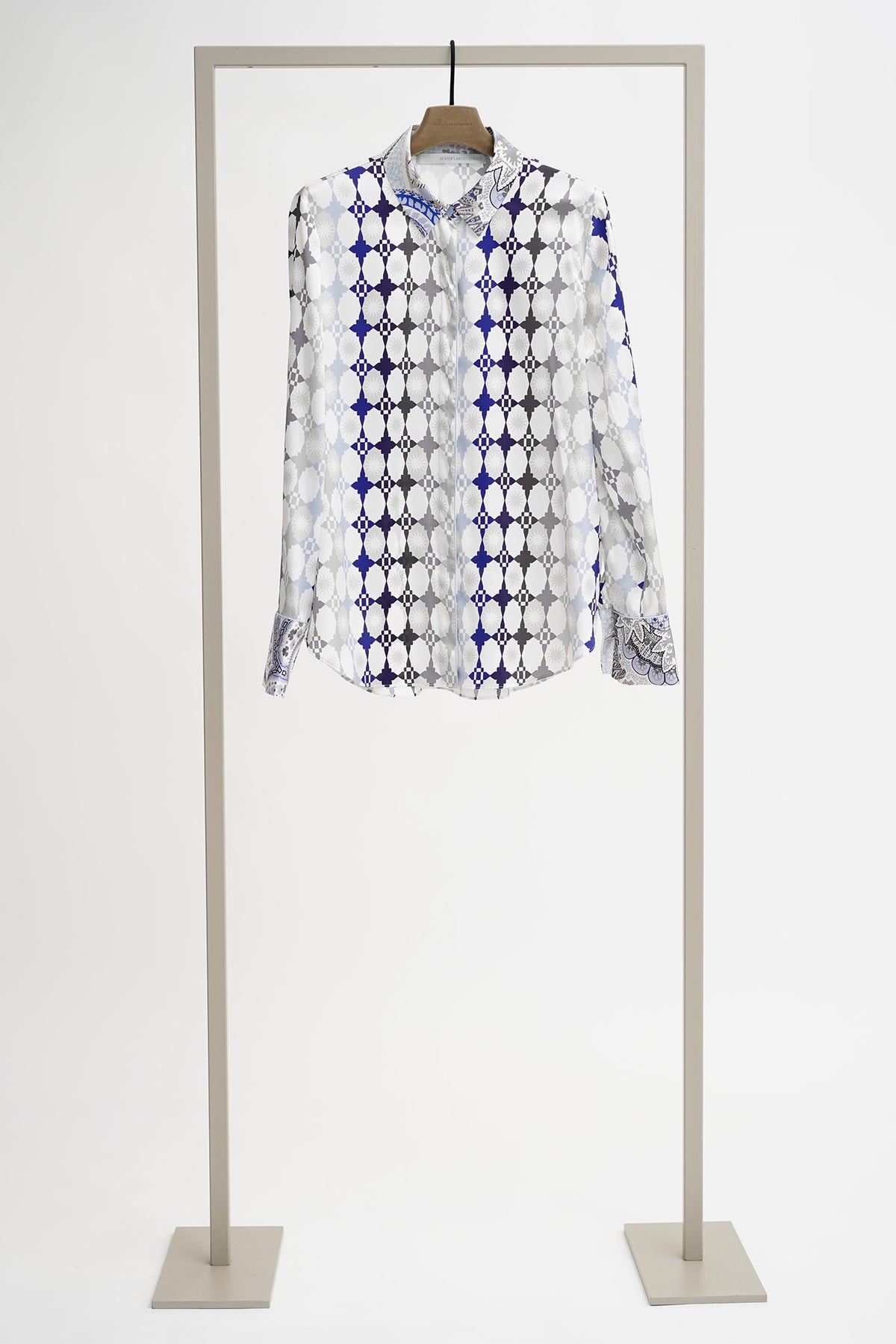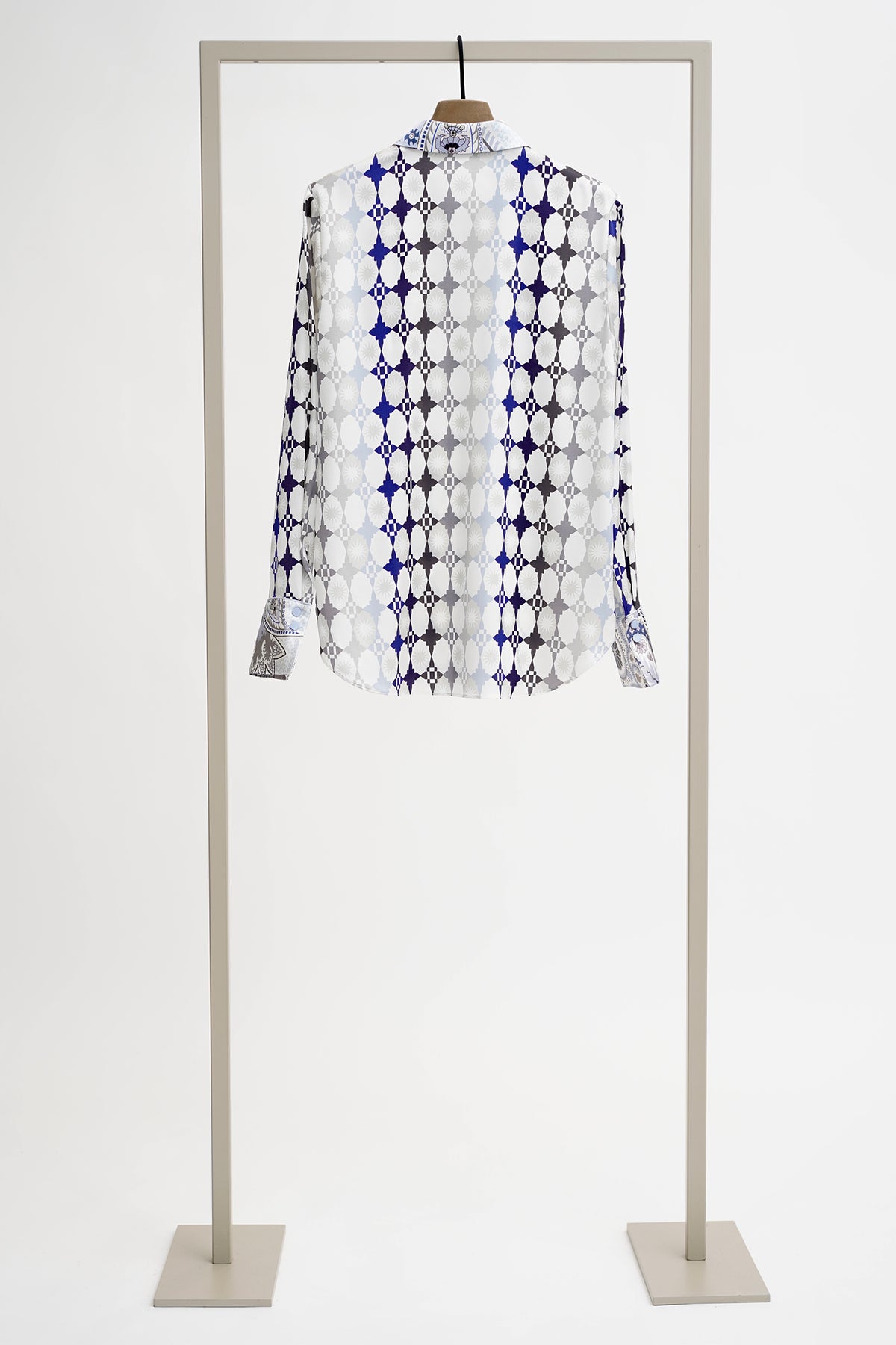 Herzen 25253-6182 Marina Blue Multicolour Print Silk Blouse is a graphic staple in pure silk—ideal for directional layering or adding polish to off-duty edits. Designed with geometric motifs and contrast trims, it balances bold patterning with elevated softness.