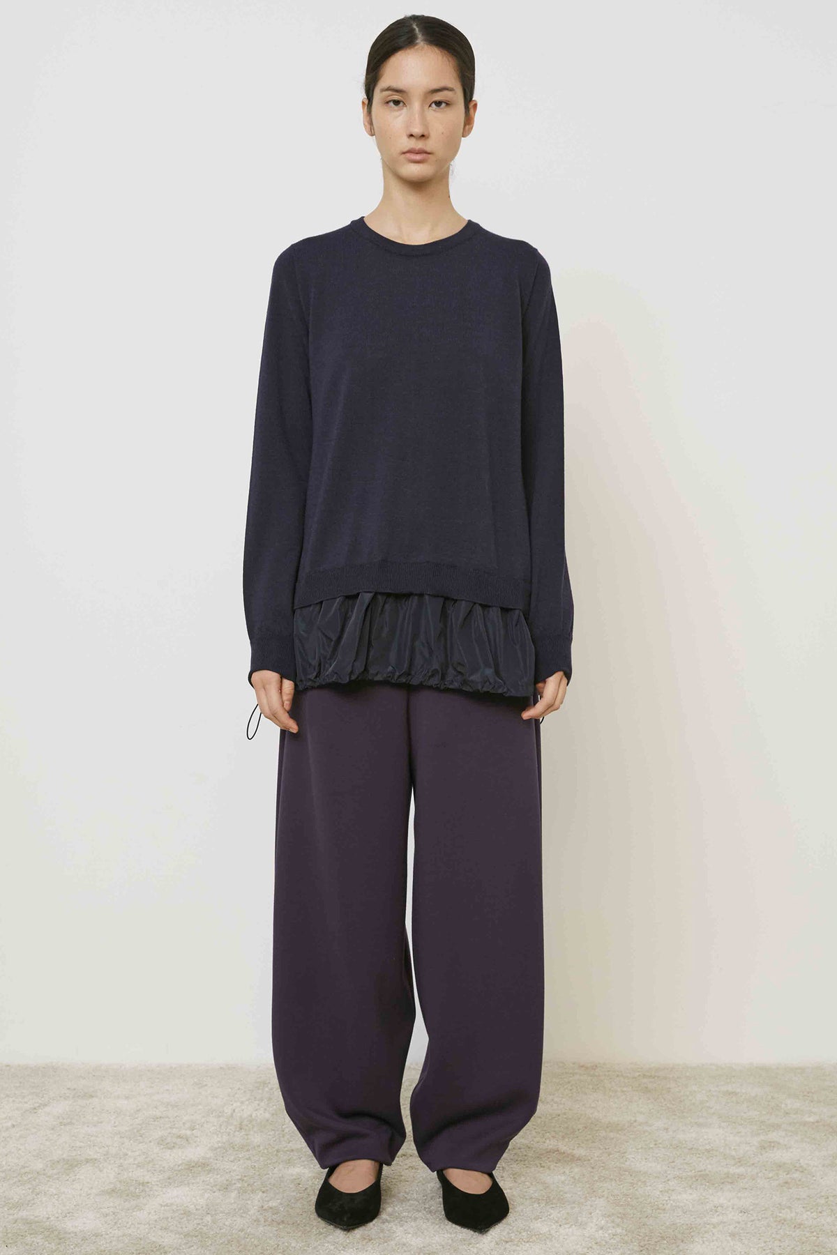 Style with wide-leg trousers and sculptural accessories for boutique polish, or layer over pleated skirts for gallery-ready refinement. The jumper’s directional silhouette and tonal depth make it a dependable choice for transitional dressing.