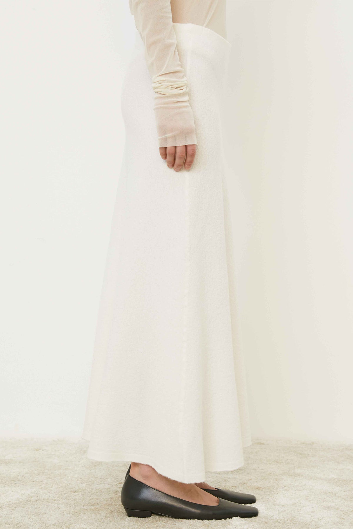 Style with ribbed knits and square-toe flats for boutique polish, or pair with sculptural tops for gallery-ready refinement. The skirt’s crisp tone and understated shape make it a dependable choice for minimalist dressing.