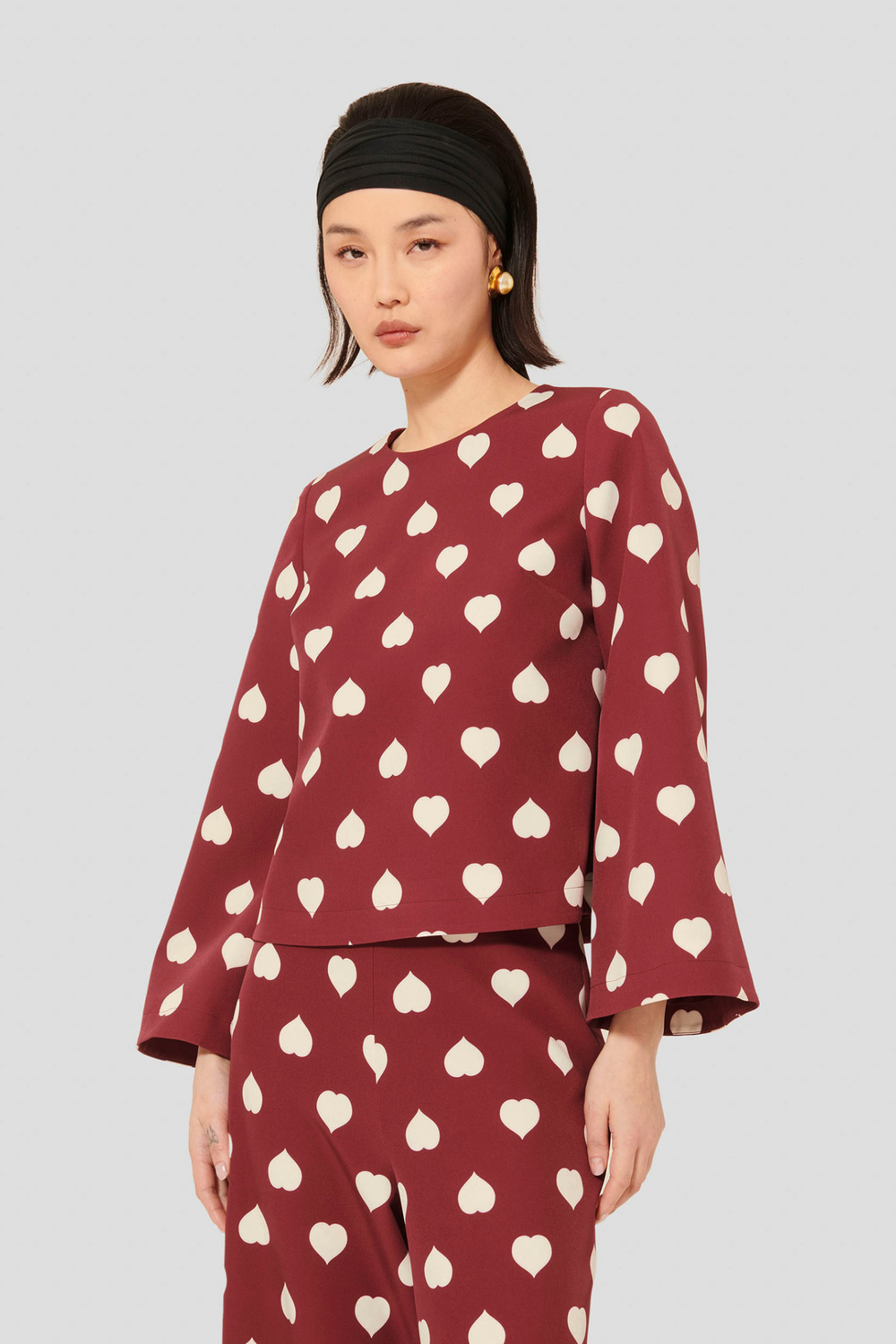 Beautiful Bordeaux Blouse with hearts. Round neck with bell sleeve. Invisible sip at the back. Great with black skirt or black trousers.