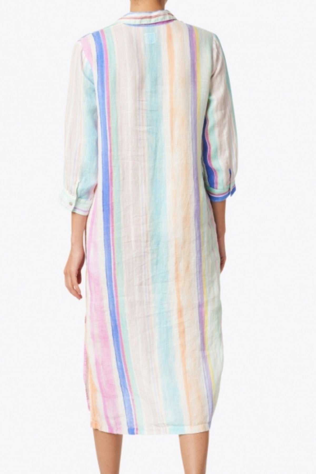 This watercolour striped shirt dress from 120% Lino with button at the front and with side slits. Pairs perfectly with sandals for summer evenings.
