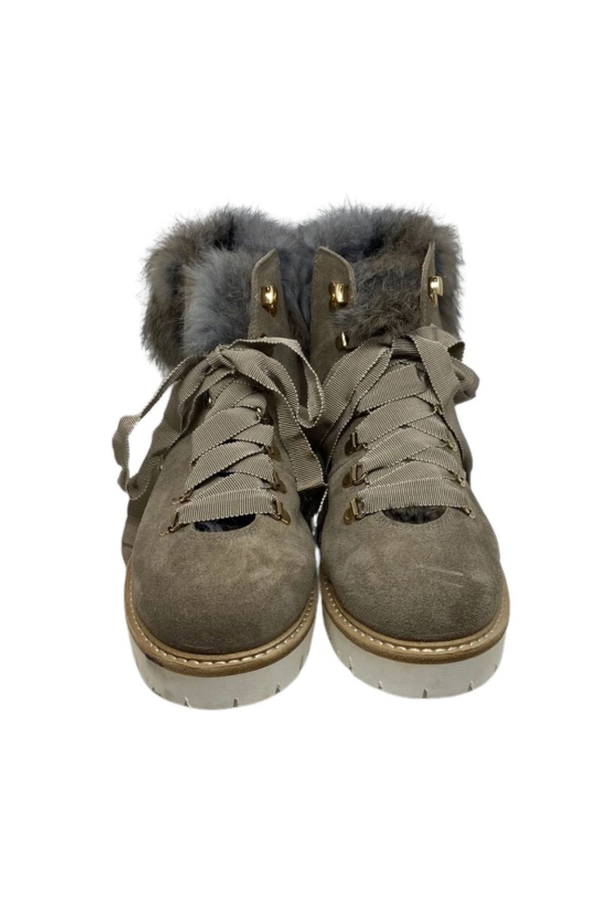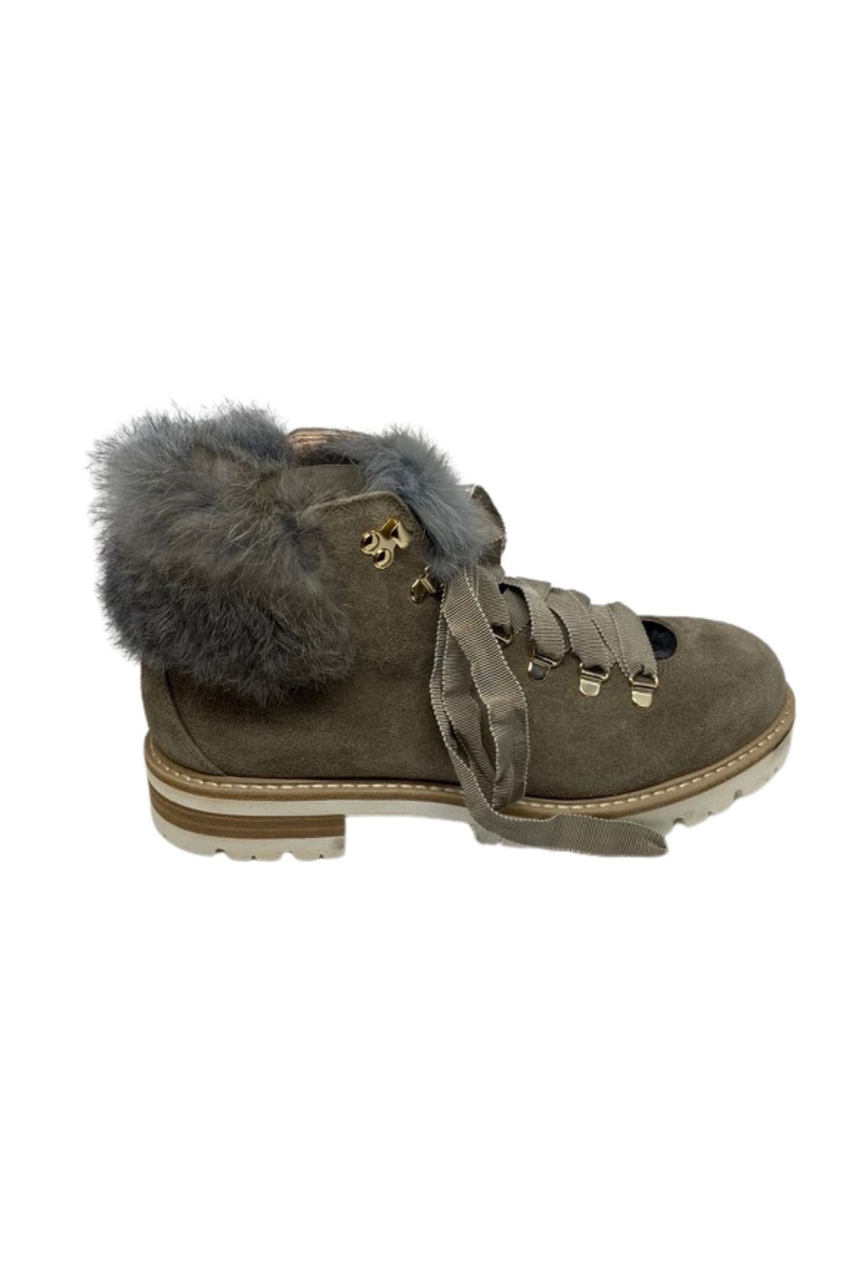 Winter boots with taupe, blue fur Lining. Round toe, sole in off white and beige.