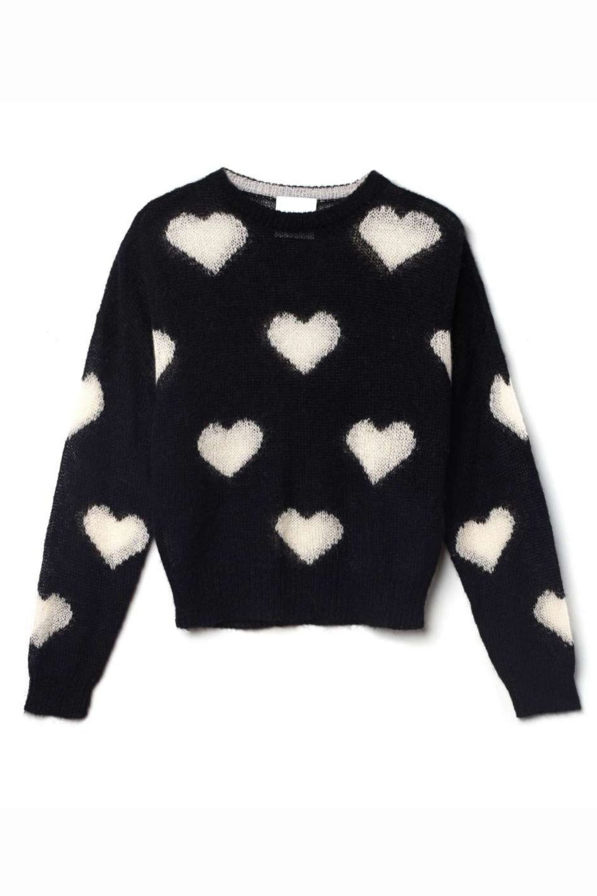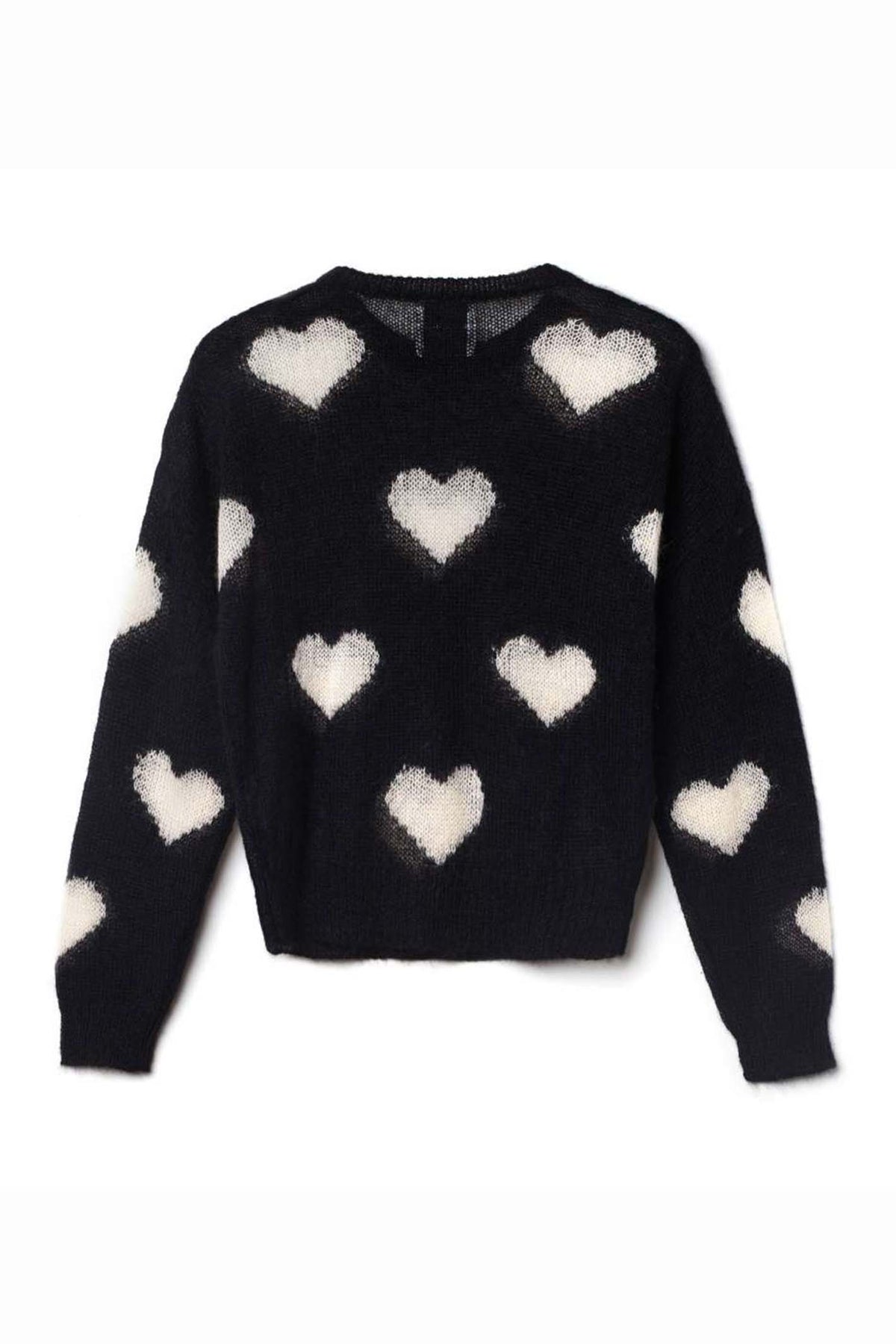 Fine knit jumper in black with ivory hearts, round neck. Great with skirts leggings or black jeans.