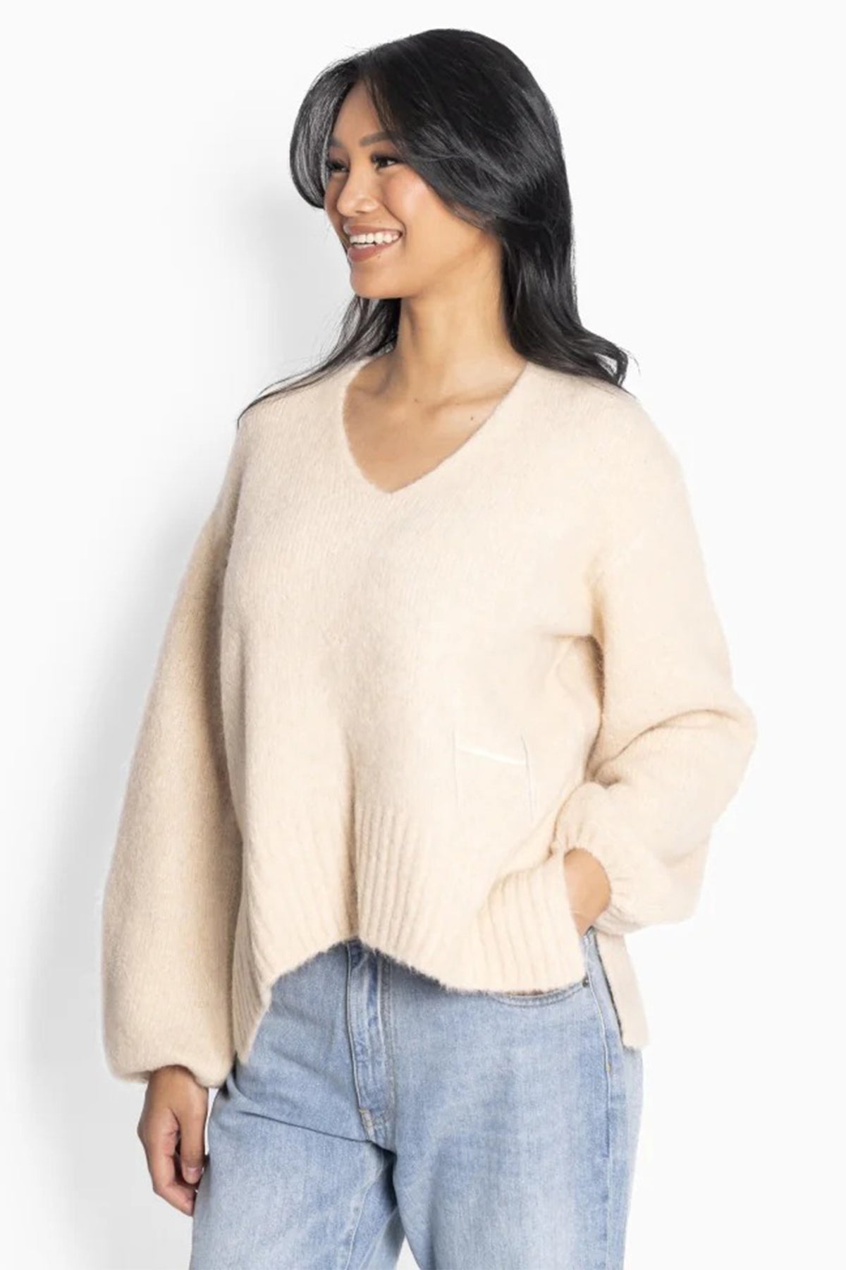A neutral essential with elevated texture, the Hest 2510120139 Sofie Summer Sand V-Neck Wool Mix Sweater blends soft structure with relaxed refinement. Its wool-alpaca blend delivers breathable warmth, while the lightly oversized silhouette and ribbed finishes offer a modern, easygoing shape. The Summer Sand tone adds a versatile base to tonal layering or contrast edits.