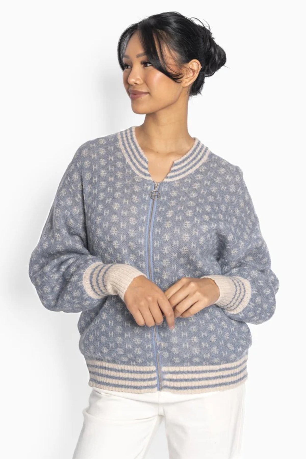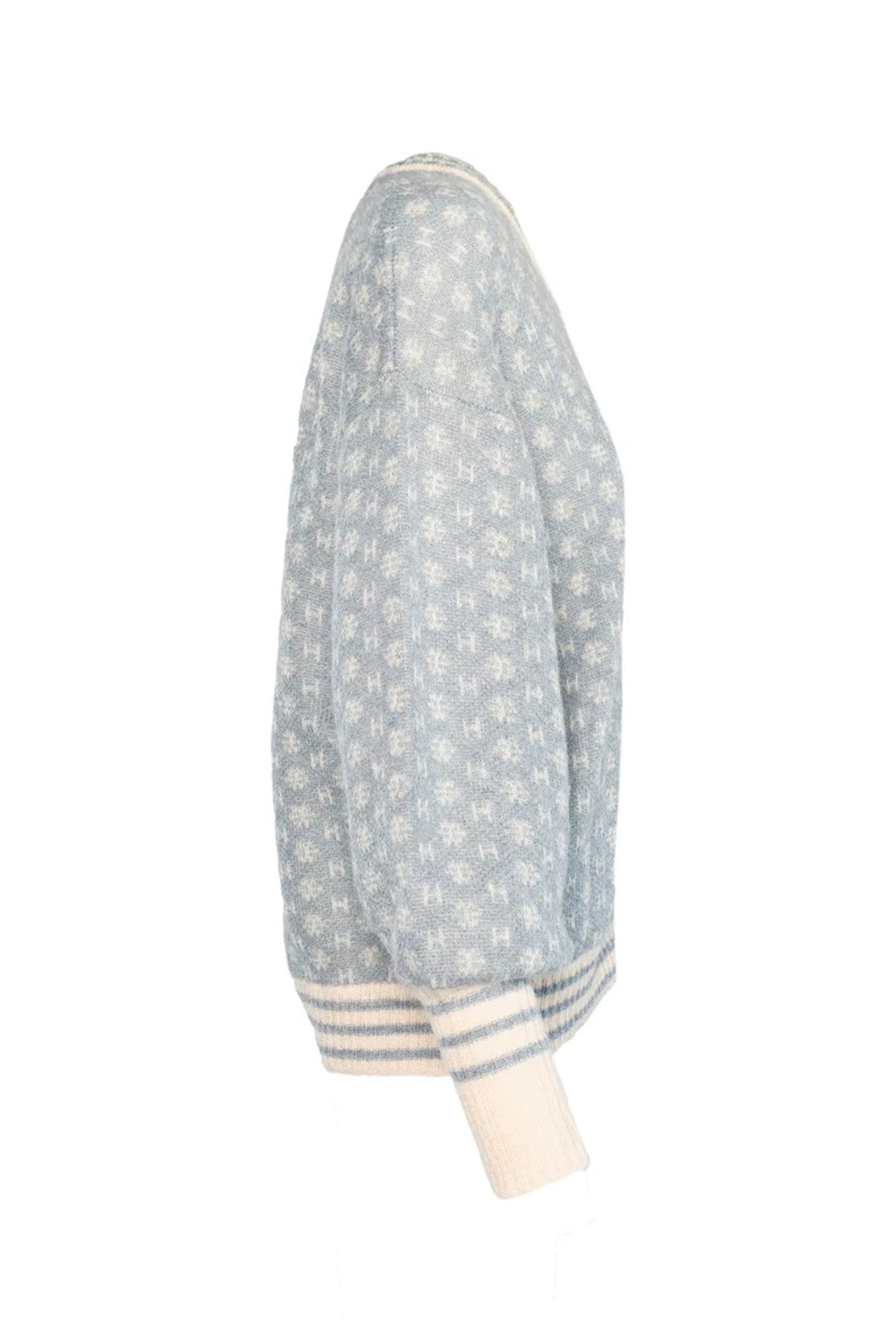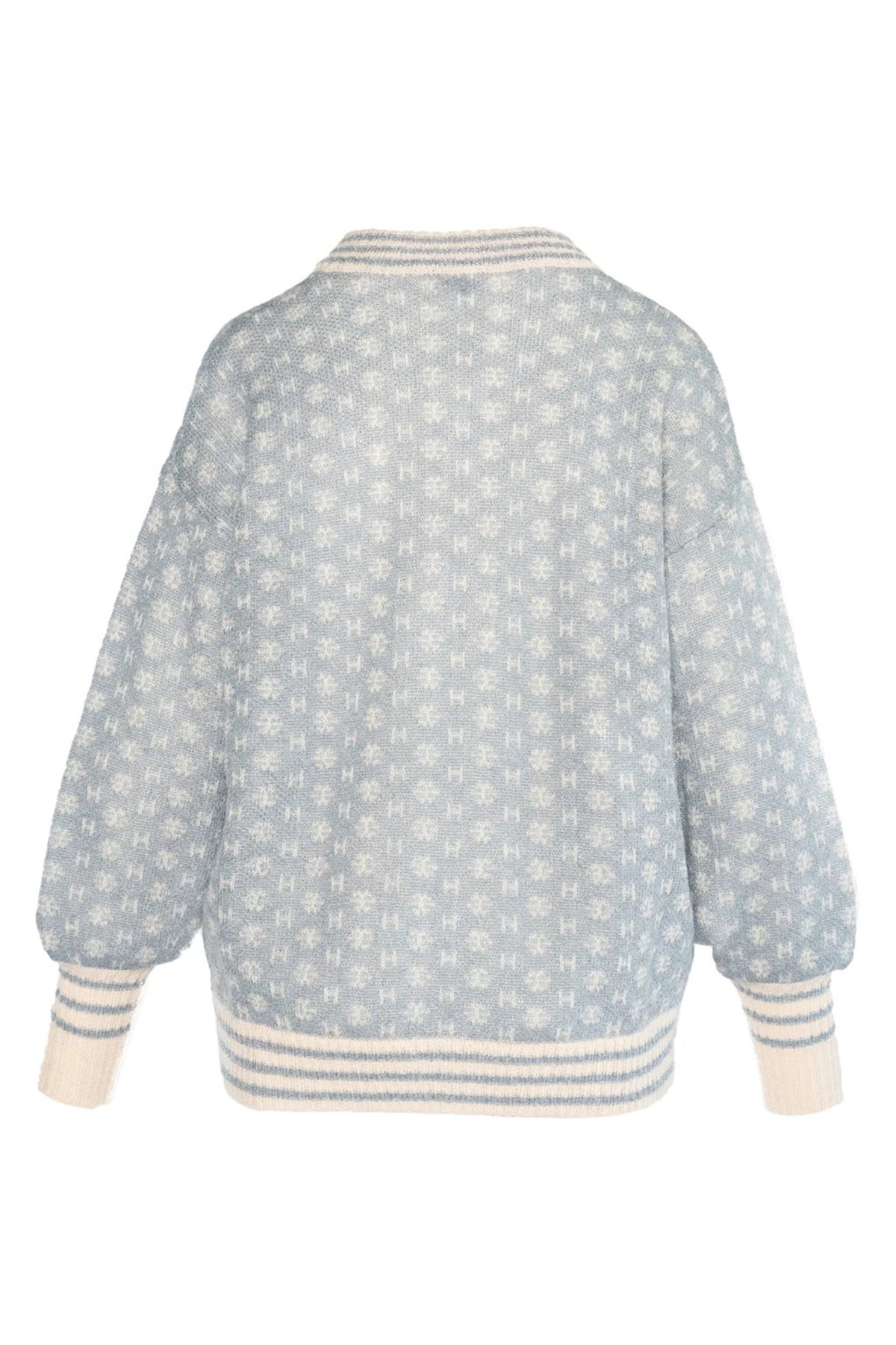 A refined staple with a graphic twist, the Hest 2510120179 Logo Faded Denim Blue Short Cardigan offers soft structure and brand-forward detailing. Made from a luxurious wool-mix blend, it features Hést’s signature mini H-logo knit in white across a faded denim blue base. The silhouette is cropped and boxy, with a zip-through front and ribbed trims for subtle definition.