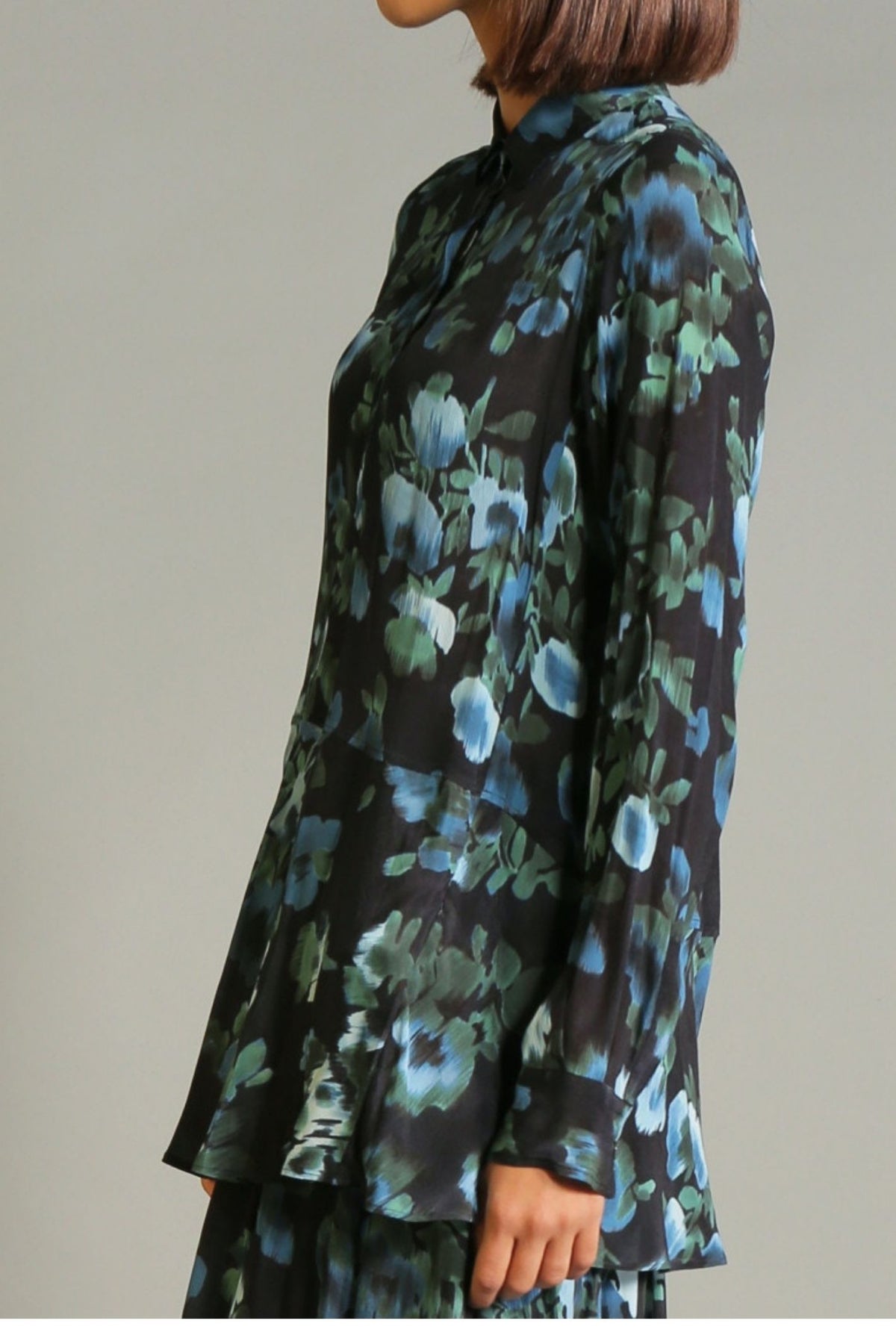 Shirt in  green and blue floral silk and rayan crepe de shine, regular fit with turndown collar with grey mother of pearls buttons. Long insert sleeves finish in a single buttons cuffs. Straight body  there has an all around waist seam over a full curved panel their drapes into  fluting full hem.