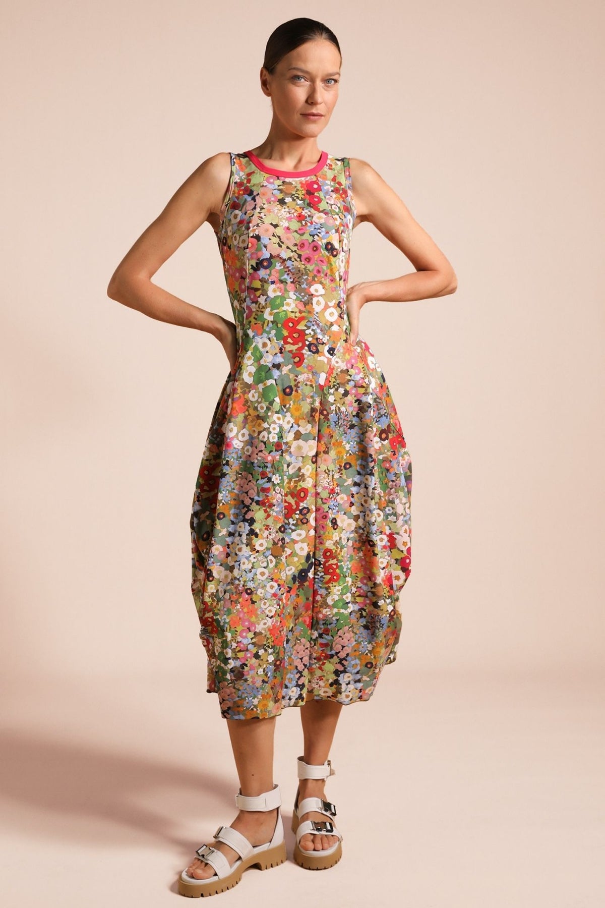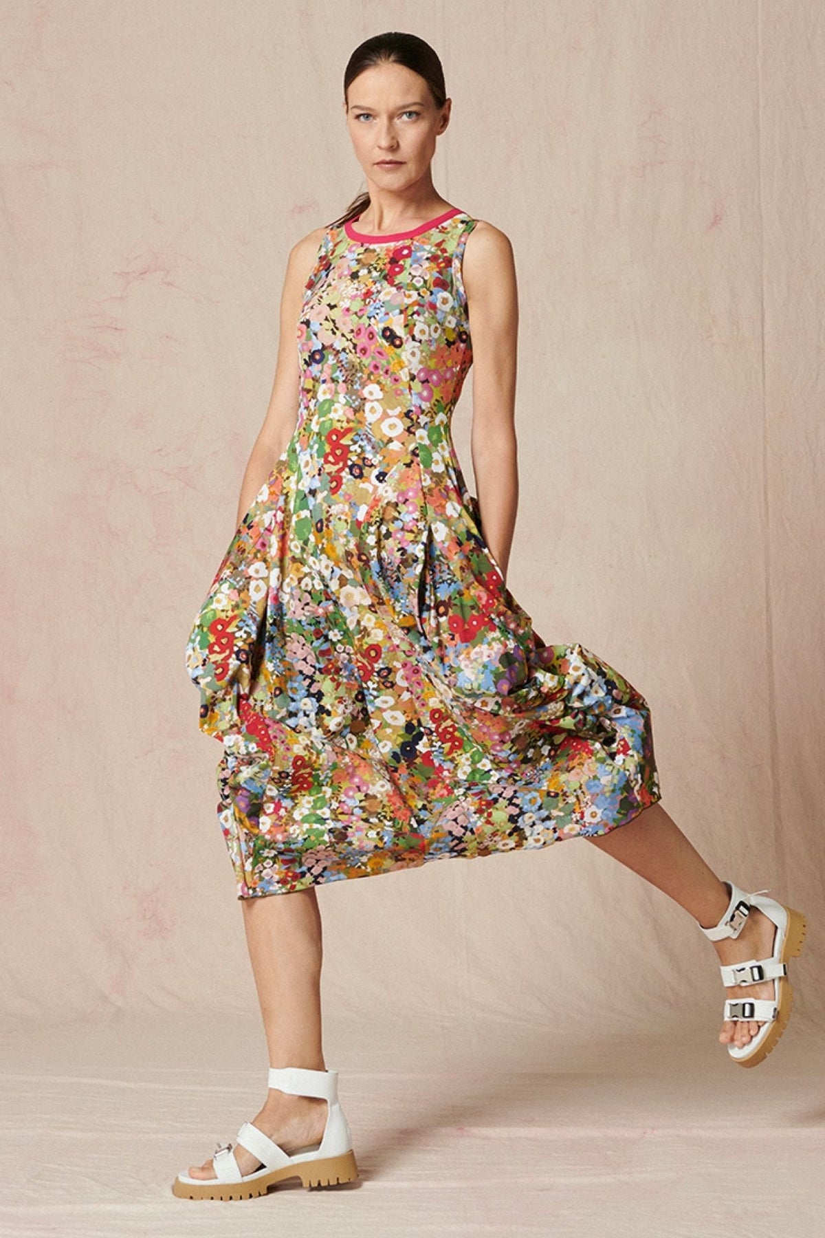 This pretty dress could take you through the day and evening. Sleeveless, floral ballon dress in a stretchy fabric. The bodice is fitted with orange detail binding the neck and armholes. The hem of the skirt dips lower at the front.