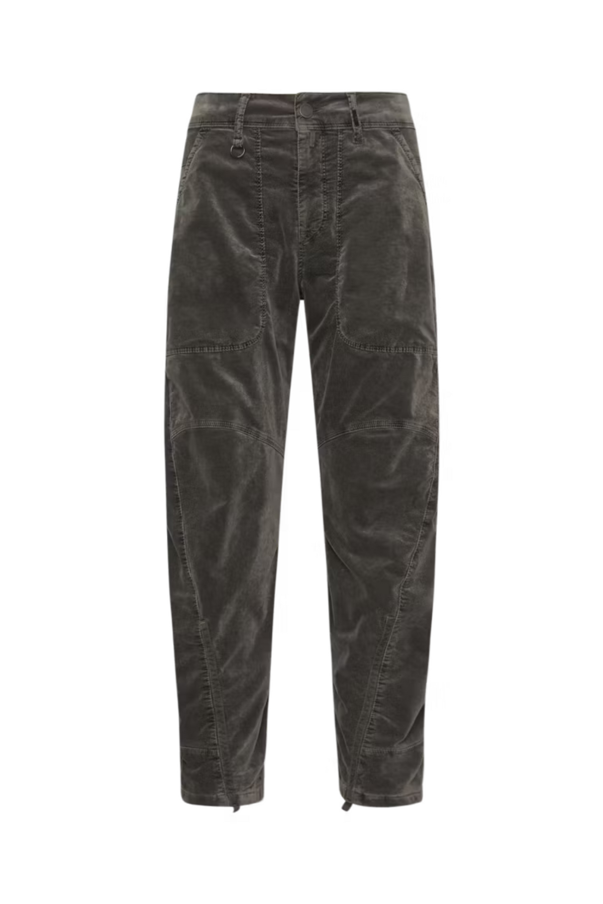 Stylish cargo designed trousers in grey stretch velour. The trousers are tapered down the leg through multi seams and panels. There is a fixed waistband and large flat front pockets.