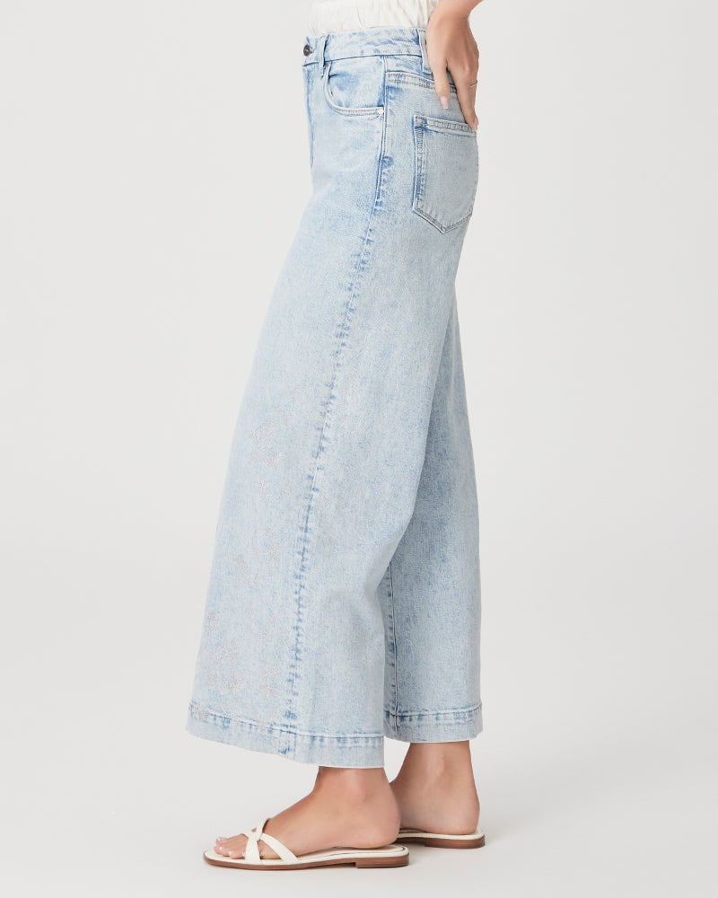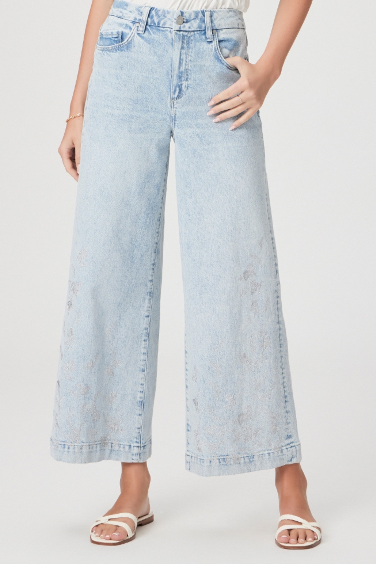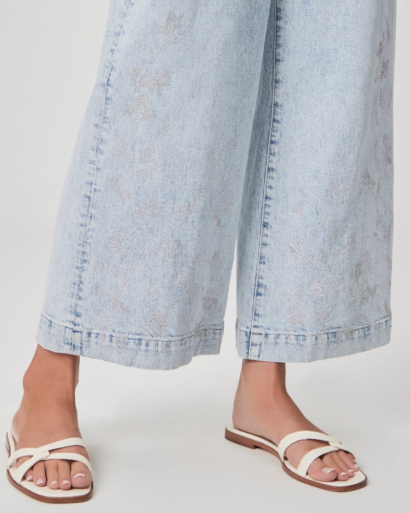 This high rise, extra wide leg has a cropped, ankle length silhouette and is cut from PAIGE VINTAGE denim in a super light vintage-inspired wash detailed with a silver lurex embroidered floral design. PAIGE VINTAGE takes all of the work out of breaking in your favorite pair of vintage jeans. We've combined the comfort of stretch with everything you love about authentic vintage denim to create super soft jeans that feel perfectly lived-in from the very first wear
